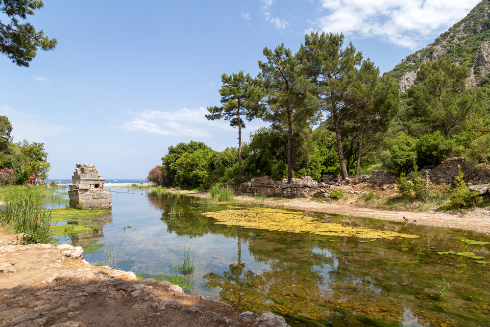 Ruins from the Lycian and Roman periods, including stone structures, baths, and sarcophagi.